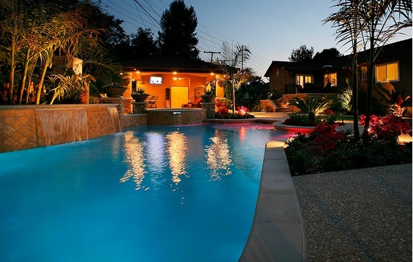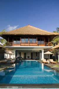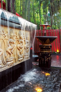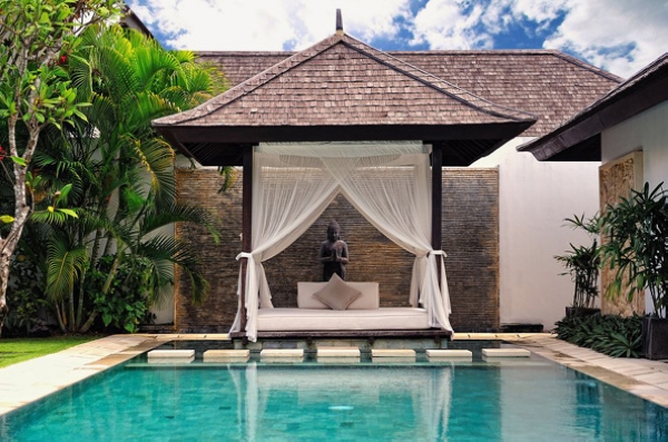 东南亚花园必备元素:具有象征意义的雕塑、大面积的游泳池、热带植物、砖红色的门、粗糙的墙壁等;