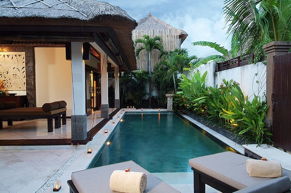 东南亚花园必备元素:具有象征意义的雕塑、大面积的游泳池、热带植物、砖红色的门、粗糙的墙壁等;